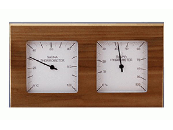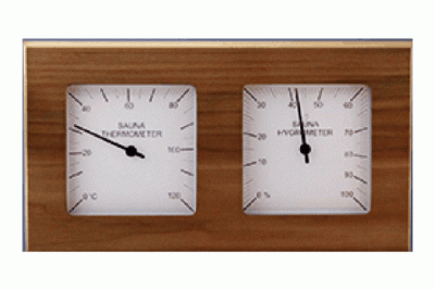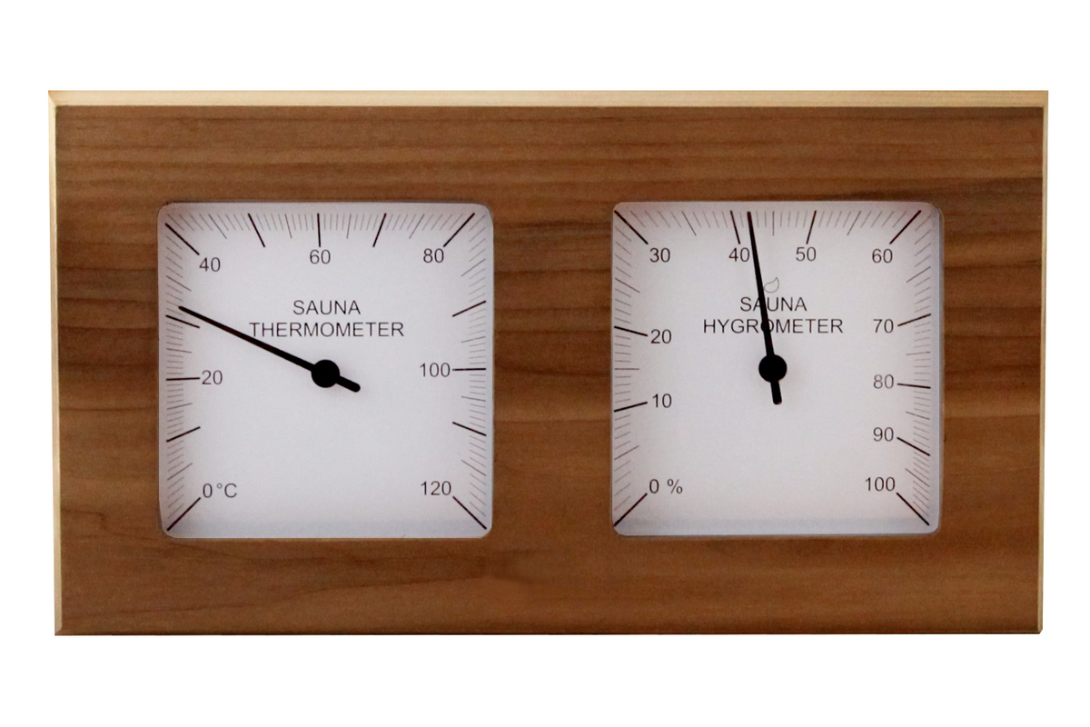 SAWO – hő és páramérő ezüst, osztott számlappal, vörös cédrus keretben. A számlap felső részében a szauna hőmérsékletét, alsó felében a szauna páratartalmának alakulását követhetjük nyomon. Esztétikus vörös cédrus keretével szaunánk meghatározó eleme lehet.